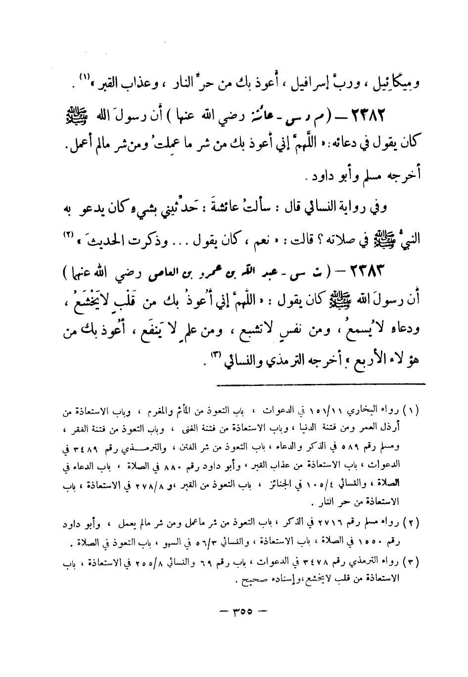 2383 - (ت س) عبد الله بن عمرو بن العاص - رضي الله عنهما -: «أَن رسولَ الله - صلى الله عليه وسلم- كان يقول: اللَّهمَّ إِني أَعُوذُ بك من قَلْبٍ لا يَخْشَعُ، ودعاءٍ لا يُسمعُ، ومن نفسٍ لا تشبع، ومن علمٍ لا يَنفَع، أعُوذ بك من هؤلاء الأربع» . أخرجه الترمذي، والنسائي (¬1) .