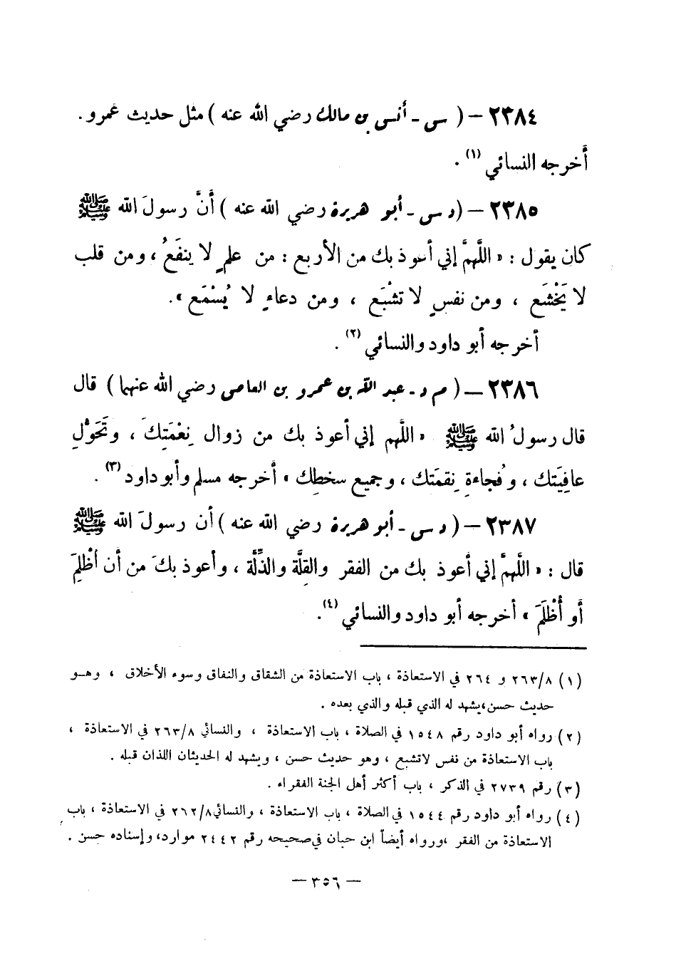 2385 - (د س) أبو هريرة - رضي الله عنه -: أَن رسولَ الله - صلى الله عليه وسلم- كان يقول: «اللَّهمَّ إني أعوذ بك من الأربع: من علمٍ لا ينفَعُ، ومن قَلْبٍ لا يَخْشَعُ، ومن نفسٍ لا تشبع، ومن دعاءٍ لا يُسمعُ» . أخرجه أبو داود، والنسائي (¬1) .