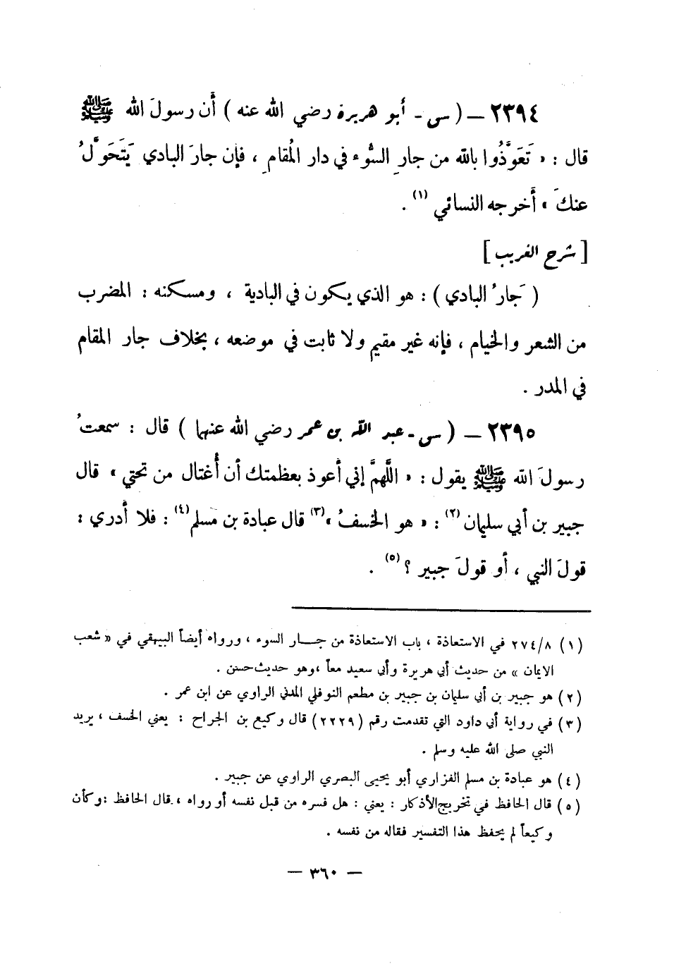 2394 - (س) أبو هريرة - رضي الله عنه -: أَنَّ رسولَ اللهِ - صلى الله عليه وسلم- قال: «تَعَوَّذُوا بالله من جارِ السُّوء في دار المُقامِ، فإن جارَ البادي يَتَحَوَّلُ عنكَ» أخرجه النسائي (¬1) .