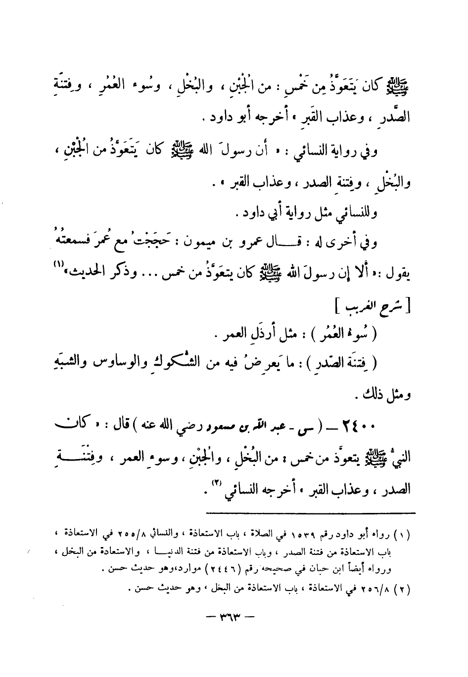 2400 - (س) عبد الله بن مسعود - رضي الله عنه -: قال: «كان النبيُّ - صلى الله عليه وسلم- يتعوَّذُ من خمسٍ: من البُخلِ، والجُبْنِ، وسوءِ العمر، وفِتْنَةِ الصدر، وعذاب القبر» أخرجه النسائي (¬1) .