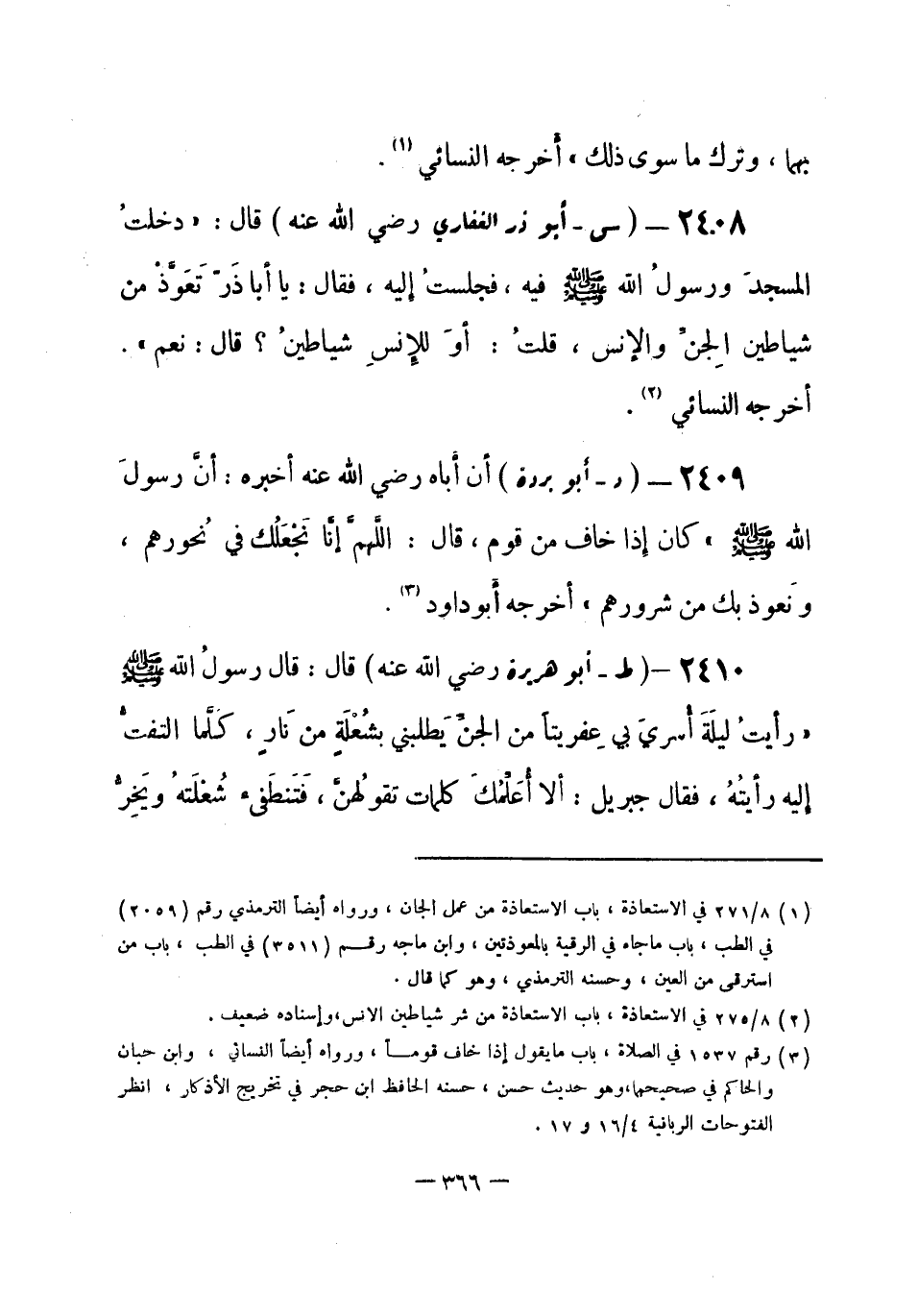 2408 - (س) أبو ذر الغفاري - رضي الله عنه -: قال: «دخلتُ المسجدَ ورسولُ الله - صلى الله عليه وسلم- فيه، فجلستُ إليه، فقال: يا أبا ذَرّ تَعَوَّذْ من شياطين الجِنِّ والإنس، قلتُ: أوَ للإِنسِ شياطينُ؟ . قال: نعم» . أخرجه النسائي (¬1) .
