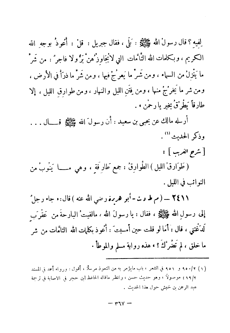 2411 - (م ط د ت) أبو هريرة - رضي الله عنه -: قال: جاء رجلٌ إلى رسولِ الله - صلى الله عليه وسلم- فقال: يا رسولَ الله، ما لقيتُ البارحةَ من عَقْرَبٍ لَدَغْتني، قال: «أمَا لو قلت حين أمسيتَ: أَعُوذ بكلمات الله التامَّات من شر ما خلق، لم تَضُرَّكَ؟» هذه رواية مسلم، والموطأ. -[368]-