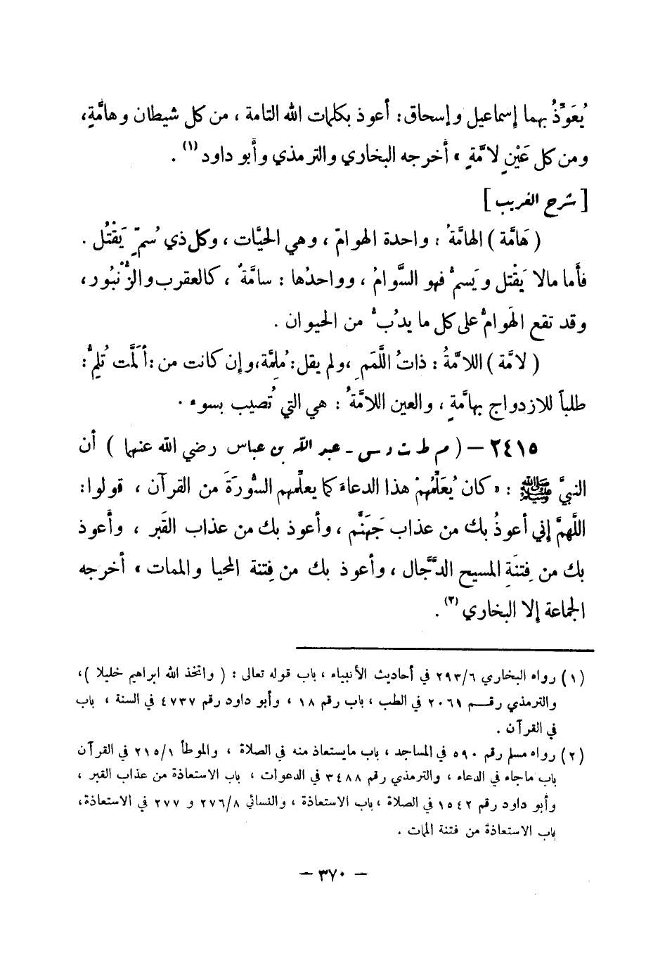 2415 - (م ط ت د س) عبد الله بن عباس - رضي الله عنهما -: «أَنَّ النبيَّ - صلى الله عليه وسلم- كان يُعَلِّمُهمْ هذا الدعاءَ كما يعلِّمهم السُّورَةَ من القرآن، قولوا: اللَّهمَّ إِني أعوذُ بك من عذاب جَهَنَّم، وأعوذ بك من عذاب القَبر، وأَعوذ بك من فِتنَةِ المسيح الدَّجَّال، وأعوذ بك من فِتنة المحيا والممات» . أخرجه الجماعة إِلا البخاري (¬1) .