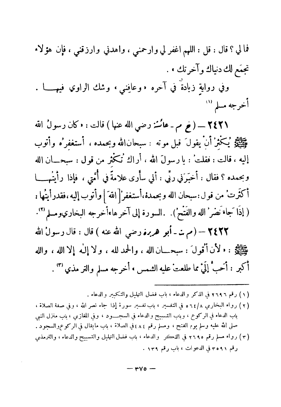 2421 - (خ م) عائشة - رضي الله عنها -: قالت: «كان رسولُ الله - صلى الله عليه وسلم- يُكْثِرُ أَنْ يَقولَ قبل موتِهِ: سبحانَ الله وبحمده، أسْتَغفِرُهُ، وأتوبُ إِليهِ، قالت: فقلتُ: يا رسولَ الله، أراكَ تُكْثِر من قول: سُبحانَ الله وبحمْدِهِ، فقال: أخبَرَني رَبِّي: أَني سأَرى علامة في أُمَّتي، فإذا رَأَيتُها أَكثَرتُ من قول: سبحان الله وبحمده، أستغفرُ [الله] وأتوب إِليه، فقد رَأيتُها: {إِذَا جَاءَ نَصْرُ اللهِ والفَتْحُ} السورة إِلى آخرها» . أخرجه البخاري، ومسلم (¬1) .