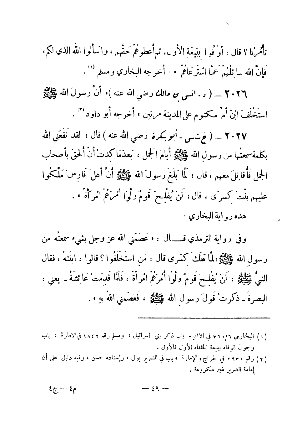 (¬1) البخاري 13 / 45 و 46 في الفتن، باب الفتنة التي تموج كموج البحر، وفي المغازي، باب كتاب النبي صلى الله عليه وسلم إلى كسرى وقيصر، والترمذي رقم (2263) في الفتن، باب لن يفلح قوم ولوا أمرهم امرأة، والنسائي 8 / 227 في القضاة، باب النهي عن استعمال النساء في الحكم، وأخرجه أيضاً أحمد في " المسند " 5 / 38 و 43 و 47 و 51.