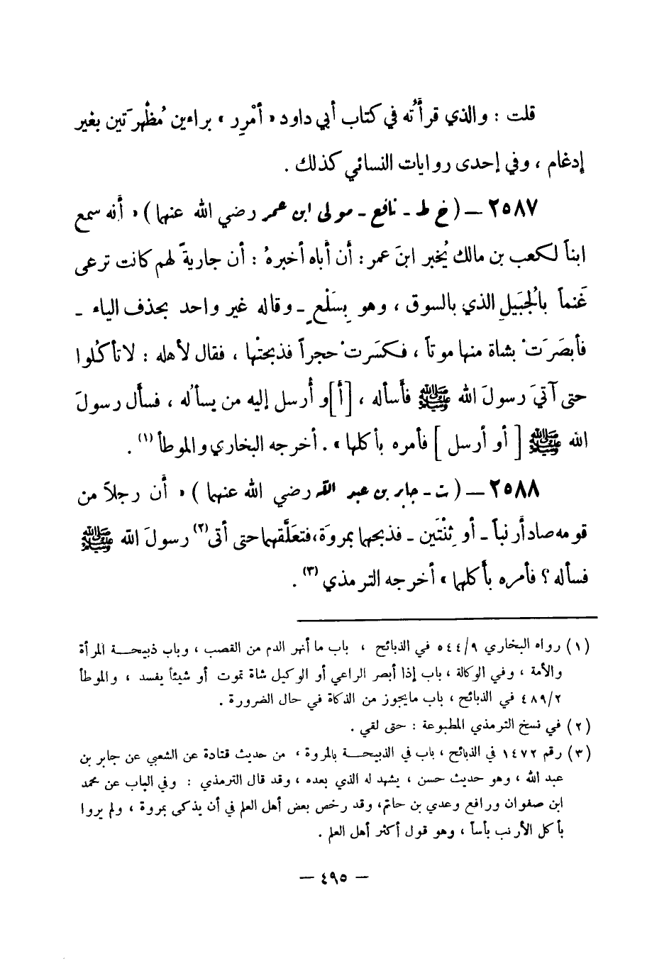 2587 - (خ ط) نافع - مولى ابن عمر - رضي الله عنهما -: «أَنه سمع ابناً لكعب بن مالك يُخبر ابنَ عمر: أَن أَباه أخبرهُ: أن جارية لهم كانت ترعى غَنماً بالجُبَيلِ الذي بالسوق، وهو بِسَلْعٍ - وقاله غير واحد بحذف الياء - فأبصَرَتْ بشاة منها موتاً، فكسَرتْ حجراً فذبحتْها، فقال لأهله: لا تأكُلوا حتى آتيَ رسولَ الله - صلى الله عليه وسلم- فأَسأله، [أَ] وأُرسل إليه من يسألُهُ، فسألَ رسولَ الله - صلى الله عليه وسلم-[أَو أَرسَلَ] فَأمَرَهُ بِأكْلِها» . أخرجه البخاري، والموطأ (¬1) .