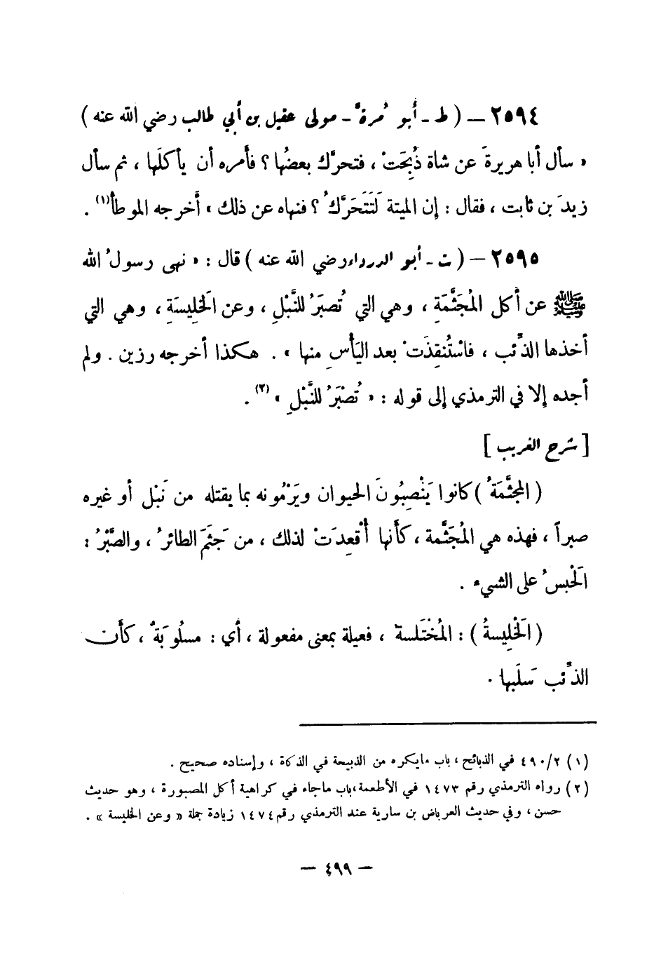 2595 - (ت) أبو الدرداء - رضي الله عنه -: قال: «نهى رسولُ الله - صلى الله عليه وسلم- عن أَكل المُجَثَّمَةِ، وهي التي تُصبَرُ للنَّبْلِ، وعن الخَلِيسَةِ، وهي التي أخذها الذِّئب، فاسْتُنقِذَتْ بعد اليَأْسِ منها» . هكذا أخرجه رزين، ولم أجده إلا في الترمذي إِلى قوله: «تُصْبَرُ للنَّبْلِ» (¬1) .