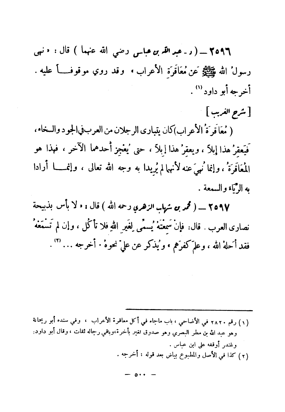 2596 - (د) عبد الله بن عباس - رضي الله عنهما -: قال: «نهى رسولُ الله - صلى الله عليه وسلم- عن مُعَاقَرَةِ الأعراب» . وقد روي موقوفاً عليه. أَخرجه أبو داود (¬1) .