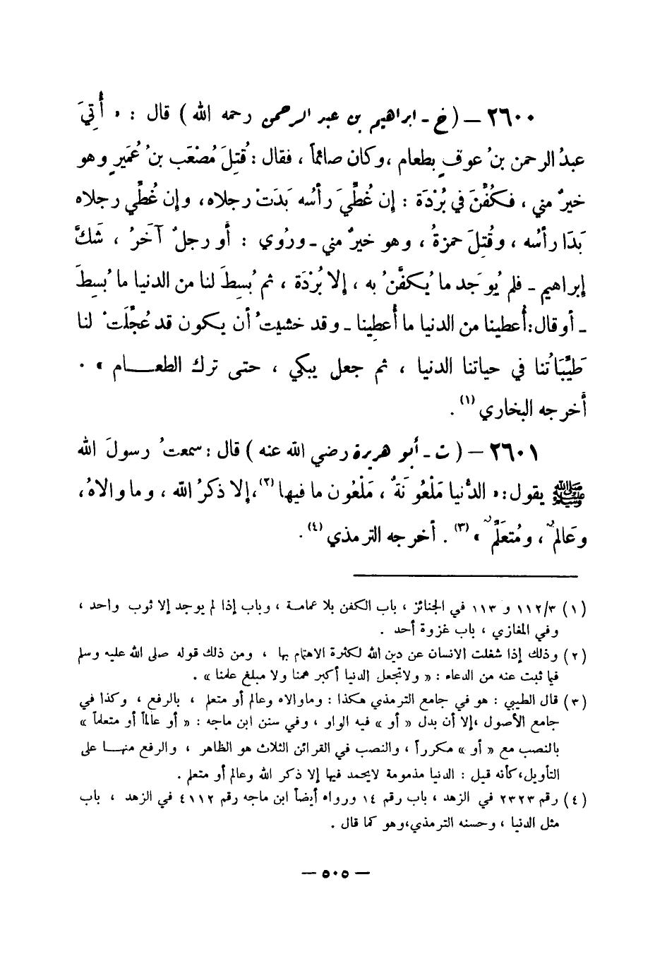2600 - (خ) إبراهيم بن عبد الرحمن - رحمه الله -: قال: «أُتِيَ عبدُ الرحمن ابنُ عوفٍ بطعام، وكان صائماً، فقال: قُتِلَ مُصْعَب بنُ عُمَيرٍ وهو خيرٌ مني، فكُفِّنَ في بُرْدَة: إِن غُطِّيَ رأْسُه بَدَتْ رجلاه، وإِن غُطِّي رجلاه بَدَا رأسُه، وقُتِلَ حمزةُ، وهو خيرٌ مني - ورُوي: أَو رجلٌ آخَرُ، شَكَّ إِبراهيم - فلم يُوَجد ما يُكفَّنُ به، إِلا بُرْدَة، ثم بُسِطَ لنا من الدنيا ما بُسِطَ - أو قال: أُعطينا من الدنيا ما أُعطينا - وقد خشيتُ أن يكون قد عُجِّلَتْ لنا طَيِّبَاتُنا في حياتنا الدنيا، ثم جعل يبكي، حتى ترك الطعام» . أَخرجه البخاري (¬1) .
