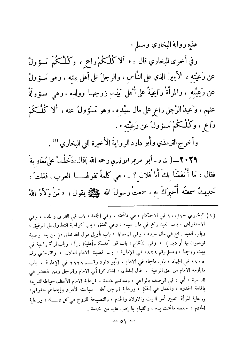 2029 - (ت د) أبو مريم الأذري - رحمه الله -: قال: دَخَلْتُ على مُعَاويةَ فقال: مَا أَنْعَمَنَا بِكَ أَبَا فُلانٍ؟ - هي كلمةٌ تقولها العرب - فقلتُ: حَدِيثٌ سمعتُه أُخْبِرُكَ بِهِ، سمعتُ رسولَ الله - صلى الله عليه وسلم- يقول: «مَنْ وَلاهُ اللهُ -[52]- شَيْئاً من أُمُورِ المسلمين فَاحْتَجَبَ دُونَ حَاجَتِهِمْ وَخَلَّتِهمْ وفَقْرِهم احْتَجَبَ اللهُ دُونَ حَاجَتِهِ وخَلَّتِهِ، وَفَقْرِهِ يَوْمَ القِيامَةِ» قال: «فَجَعلَ مُعَاوِيَةُ رَجُلاً على حَوَائِجِ النَّاسِ» . أخرجه أبو داود.