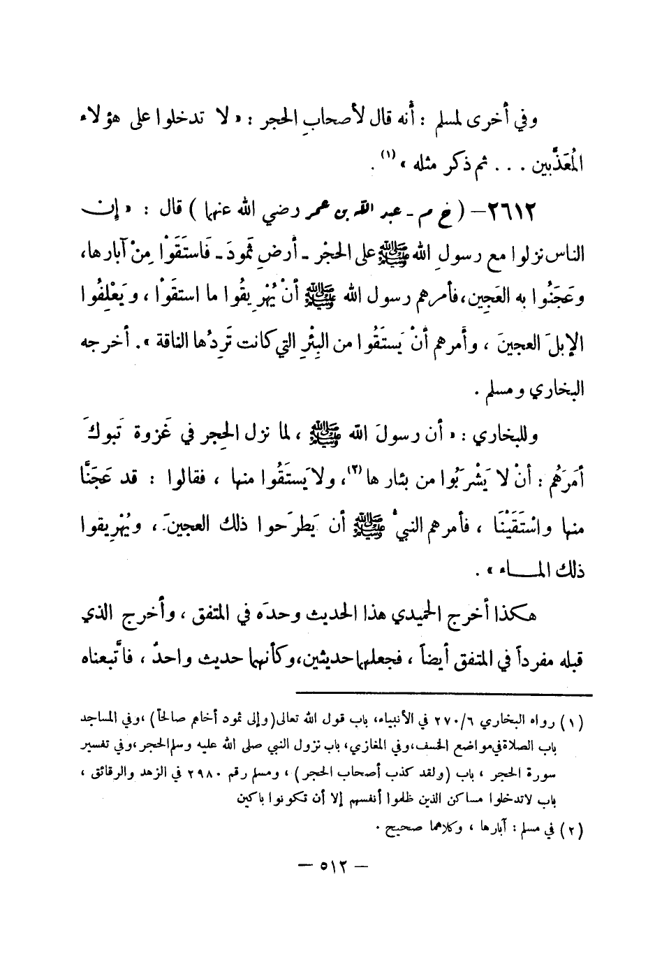2612 - (خ م) عبد الله بن عمر - رضي الله عنهما -: قال: «إِنَّ الناس نزلوا مع رسولِ الله - صلى الله عليه وسلم- على الحجْر - أرضِ ثَمودَ - فَاستَقَوْا مِنْ آبارها، وعَجَنُوا به العَجِين، فأمرهم رسول الله - صلى الله عليه وسلم- أنْ يُهْرِيقُوا ما استقَوْا، ويَعْلِفُوا الإِبلَ العجينَ، وأَمرهم أَنْ يَستَقُوا من البِئْرِ التي كانت تَرِدُها الناقة» . أخرجه البخاري، ومسلم.