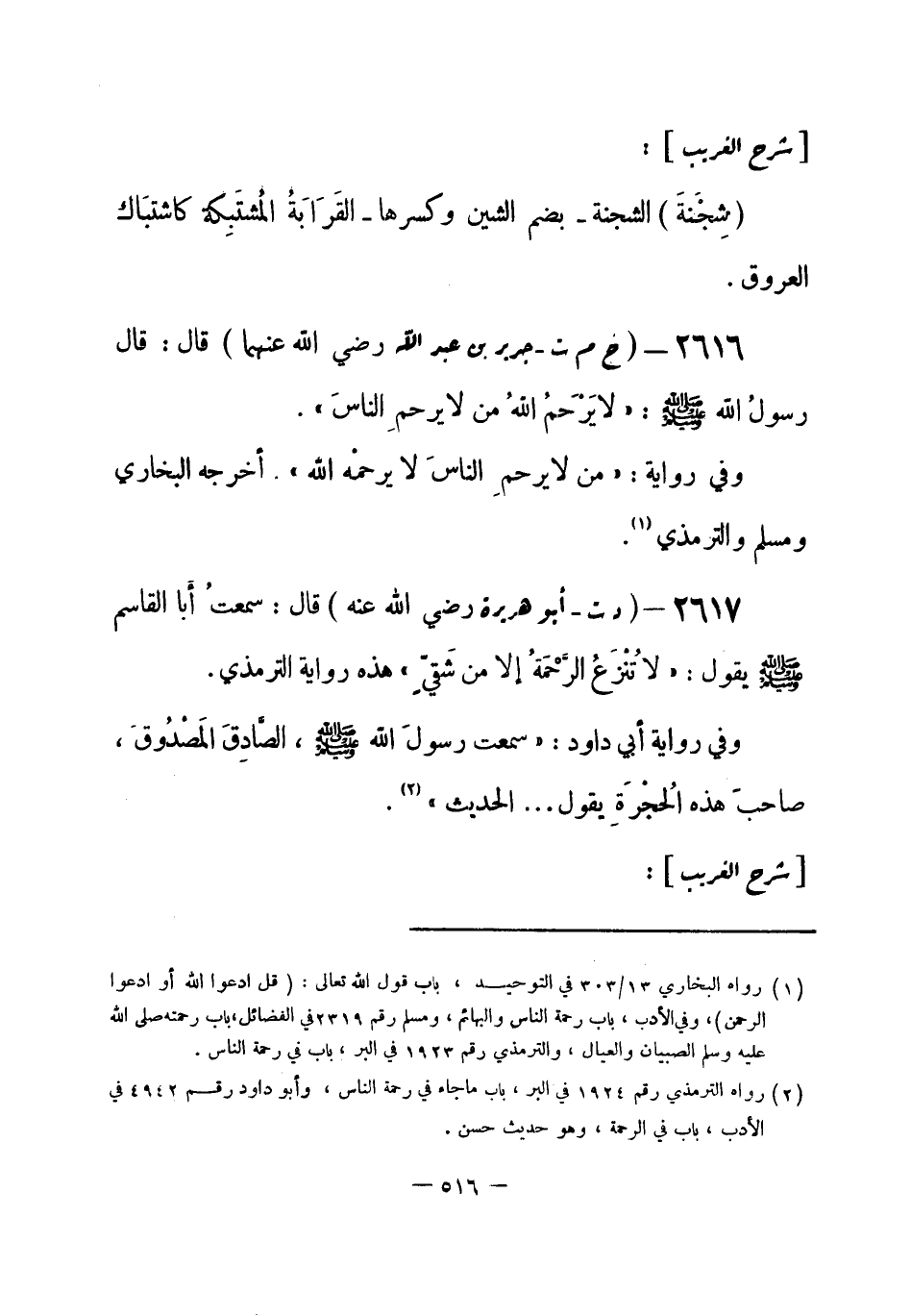 2616 - (خ م ت) جرير بن عبد الله - رضي الله عنهما -: قال: قال رسول الله - صلى الله عليه وسلم-: «لا يَرْحَمُ اللهُ من لا يرحمِ الناسَ» .
