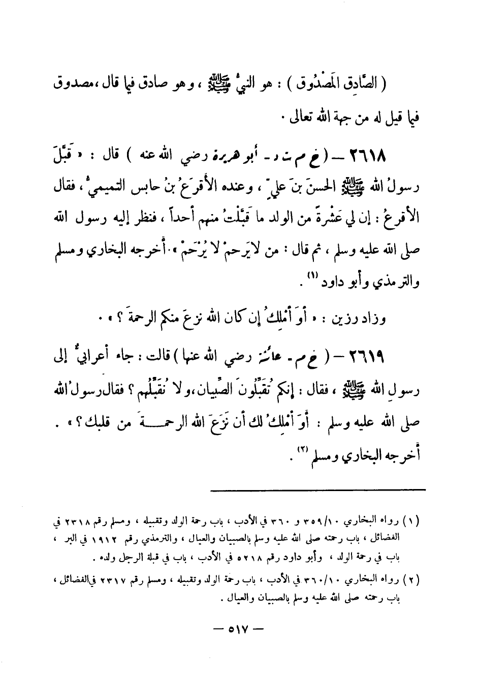 (¬1) رواه البخاري 10 / 359 و 360 في الأدب، باب رحمة الولد وتقبيله، ومسلم رقم (2318) في الفضائل، باب رحمته صلى الله عليه وسلم بالصبيان والعيال، والترمذي رقم (1912) في البر، باب في رحمة الولد، وأبو داود رقم (5218) في الأدب، باب في قبلة الرجل ولده.