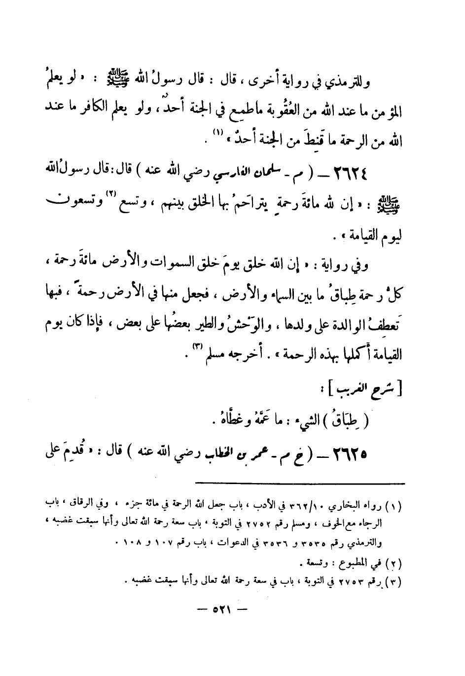 2624 - (م) سلمان الفارسي - رضي الله عنه -: قال: قال رسول الله -صلى الله عليه وسلم-: «إِنَّ للهِ مِائَةَ رَحمةٍ يَتراحَمُ بِهَا الخَلْقُ بَينهمْ، وتِسعٌ (¬1) وتِسعُونَ لِيومِ الْقِيَامَةِ» .
