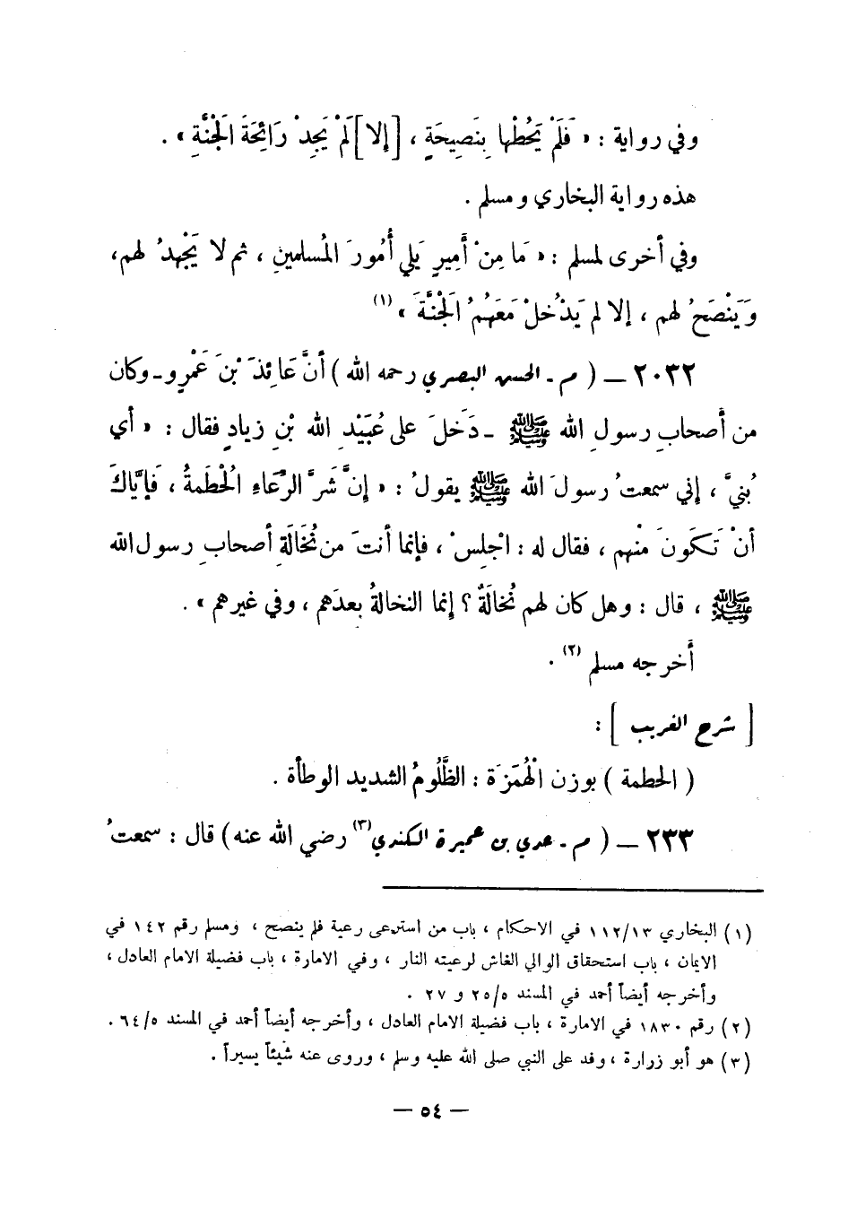 2032 - (م) الحسن البصري - رحمه الله-: أَنَّ عَائِذَ بْنَ عَمْرو - وكان من أصحابِ رسولِ الله -صلى الله عليه وسلم- دَخَلَ على عُبَيْدِ الله بْنِ زيادٍ فقال: أي بُنيَّ، إني سمعتُ رسولَ الله -صلى الله عليه وسلم- يقولُ: «إِنَّ شَرَّ الرِّعَاءِ الحُطَمَةُ» ، فَإِيَّاكَ أَنْ تَكُونَ منهم، فقال له: اجْلِسْ، فإنما أنتَ من نُخَالَةِ أصحابِ رسول الله - صلى الله عليه وسلم- قال: «وهل كان لهم نُخَالَةٌ؟ إنما النخالةُ بعدهم، وفي غيرهم» . أخرجه مسلم (¬1) .