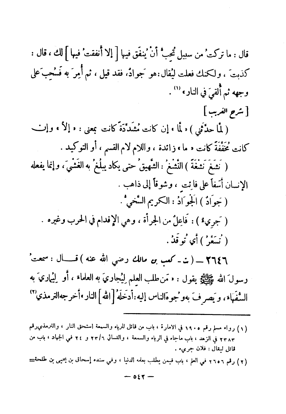 2646 - (ت) كعب بن مالك - رضي الله عنه -: قال: سمعتُ رسولَ الله - صلى الله عليه وسلم- يقول: «مَن طلبَ العِلمَ لِيُجاريَ بهِ العُلَمَاءَ، أَو لِيُمَاريَ بِهِ السُّفَهَاءَ، ويصرِفَ بِهِ وُجُوهَ النَّاسِ إِليه: أَدْخَلَهُ [الله] النَّار» . أَخرجه الترمذي (¬1) . -[543]-