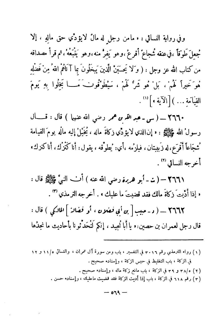 2660 - (س) عبد الله بن عمر - رضي الله عنهما -: قال: قال رسول الله - صلى الله عليه وسلم-: «إِن الذي لا يؤدِّي زكاةَ ماله، يُخَيَّلُ إِليه مالُه يومَ القيامة شُجَاعاً أَقْرَع، له زَبيبتان، فيلزمُه، أي: يُطوِّقه، يقول: أَنا كَنْزُكَ، أَنا كَنزك» . أخرجه النسائي (¬1) .