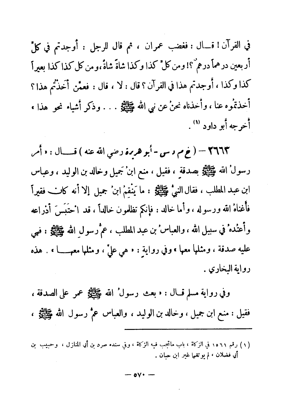 2663 - (خ م د س) أبو هريرة - رضي الله عنه -: قال: «أَمر رسولُ الله - صلى الله عليه وسلم- بصدقةٍ، فقيل: منع ابنُ جَميل وخالد بن الوليد، وعباس بن عبد المطلب، فقال النبيُّ- صلى الله عليه وسلم-: ما يَنْقِمُ ابنُ جميل إِلا أنه كان فقيراً فأغناه الله ورسوله، وأما خالد: فإنكم تظلمون خالداً، قد احْتَبَسَ أدْرَاعه وأعتُدهُ في سبيل الله، والعباسُ بن عبد المطلب، عمُّ رسولِ الله - صلى الله عليه وسلم-: فهي عليه صدقة، ومثلها معها» . وفي روايةٍ: «هي عليَّ، ومثلها معها» . هذه رواية البخاري.