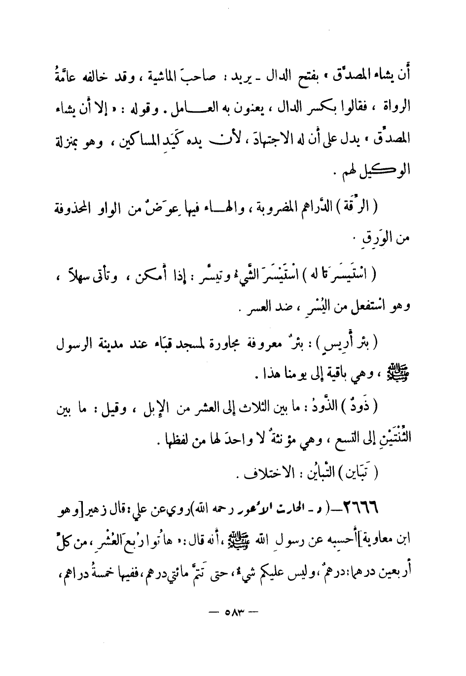 2666 - (د) الحارث الأعور - رحمه الله -: روي عن علي: قال زهير [وهو ابن معاوية] : أَحسِبه عن رسولِ الله -صلى الله عليه وسلم- أَنه قال: «هاتُوا رُبعَ العُشْرِ، من كلِّ أربعين درهماً: درهمٌ، وليس عليكم شيءٌ، حتى تَتمَّ مائتي درهم، ففيها خمسة دراهم، -[584]- فما زاد، فعلى حساب ذلك، وفي الغنم، في كلِّ أربعين شاة: شاةٌ، فإِن لم يكن إِلا تسعة وثلاثين: فليس عليك فيها شيء» ... وساق صدقة الغنم مثل الزهري.