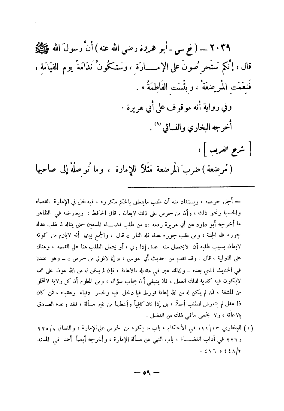 (¬1) البخاري 13 / 111 في الأحكام، باب ما يكره من الحرص على الإمارة، والنسائي 8 / 225 و 226 في آداب القضاة، باب النهي عن مسألة الإمارة، وأخرجه أيضاً أحمد في " المسند " 2 / 448 و 476.