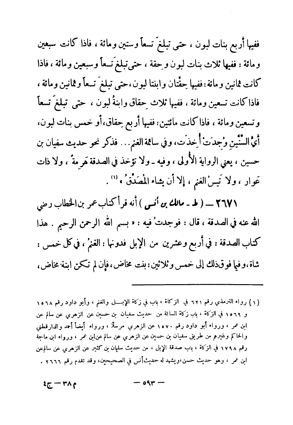 2671 - (ط) مالك بن أنس: أَنه قرأ كتاب عمر بن الخطاب- رضي الله عنه - في الصدقة، قال: فوجدتُ فيه: «بسم الله الرحمن الرحيم. هذا كتاب الصدقة: في أَربع وعشرين من الإِبل فدونها: الغنمُ، في كل خمس: شاة، وفيما فوق ذلك إِلى خمس وثلاثين: بنت مخاض، فإِن لم تكن ابنة مخاض، -[594]- فابن لبون ذَكَر، وفيما فوق ذلك إِلى خمس وأربعين: بنتُ لبون، وفيما فوق ذلك إلى ستين: حِقَّة، طَروقة الفَحْل، وفيما فوق ذلك إِلى خمس وسبعين جَذَعة، وفيما فوق ذلك إِلى تسعين: ابنتا لبون، وفيما فوق ذلك إِلى عشرين ومائة: حِقتان طروقتا الفحل، فما زاد على ذلك من الإبل، ففي كل أربعين: ابنةُ لبون، وفي كل خمسين: حِقة. وفي سائمة الغنم: إِذا بلغت أَربعين إلى عشرين ومائة: شاةٌ، وفيما فوق ذلك إِلى مائتين: شاتان. وفيما فوق ذلك إِلى ثلاثمائة: ثلاث شياه، فما زاد على ذلك ففي كل مائةٍ شاةٌ، ولا يُخْرَجُ في الصدقة تَيْسٌ، ولا هَرِمَةٌ، ولا ذاتُ عَوَارٍ، إِلا ما شاء المُصَدِّق، ولا يُجْمَعُ بين مُتَفَرِّقٍ، ولا يُفَرَّقُ بين مُجْتَمِعٍ، خشية الصدقة، وما كان من خليطين فإنهما يتراجعان بينهما بالسوية، وفي الرِّقَةِ: رُبُعُ العُشرِ» . أَخرجه الموطأ (¬1) .