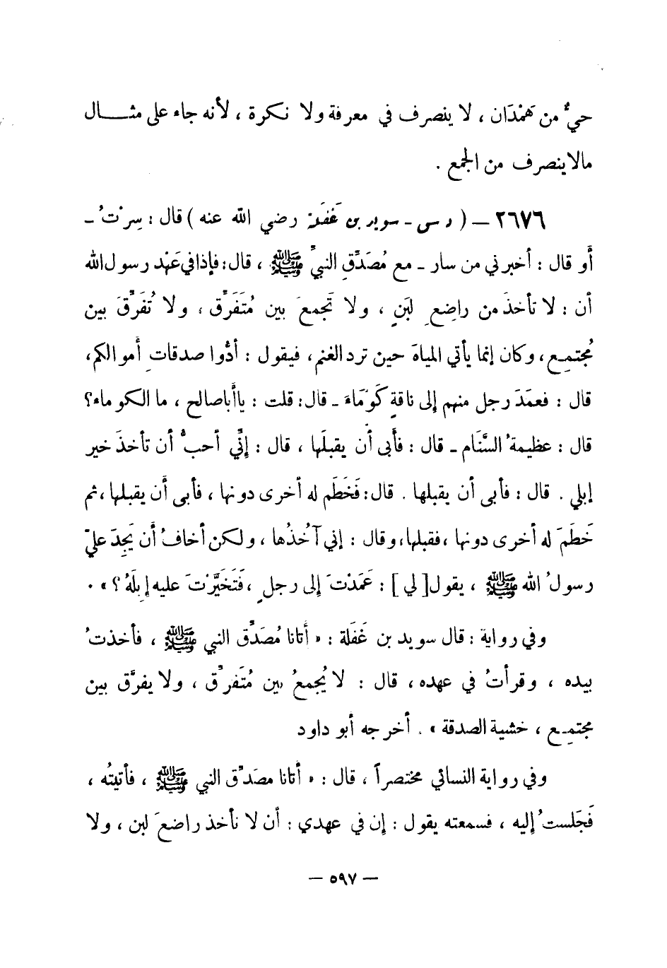 2676 - (د س) سويد بن غَفلَة - رضي الله عنه -: قال: سِرْتُ - أو قال: أخبرني من سار - مع مُصَدِّقِ النبيِّ - صلى الله عليه وسلم-، قال: فَإِذا في عَهْد رسول الله أن: لا تأخذَ من راضِعِ لَبنٍ، ولا تَجمعَ بين مُتَفَرِّق، ولا تُفَرِّقَ بين مُجتمِع، وكان إنما يأتي المياهَ حين ترد الغنم، فيقول: أدُّوا صدقاتِ أَموالكم، قال: فعمَدَ رجل منهم إِلى ناقةٍ كَومَاءَ- قال: قلت: يا أَبا صالح، ما الكوماء؟ قال: عظيمةُ السَّنَام - قال: فأبى أن يقبلَها، قال: إِنِّي أُحبُّ أن تأخذَ خير إِبلي، قال: فأبى أن يقبلها، قال: فَخَطَم له أخرى دونها، فأبى أَن يقبلها، ثم خَطَمَ له أخرى دونها، فقبلها، وقال: إِني آخُذُها، ولكن أخافُ أَن يَجِدَ عليّ رسولُ الله - صلى الله عليه وسلم-، يقول [لي] : «عَمَدْتَ إِلى رجلٍ، فَتَخَيَّرْتَ عليه إِبلَهُ؟» .