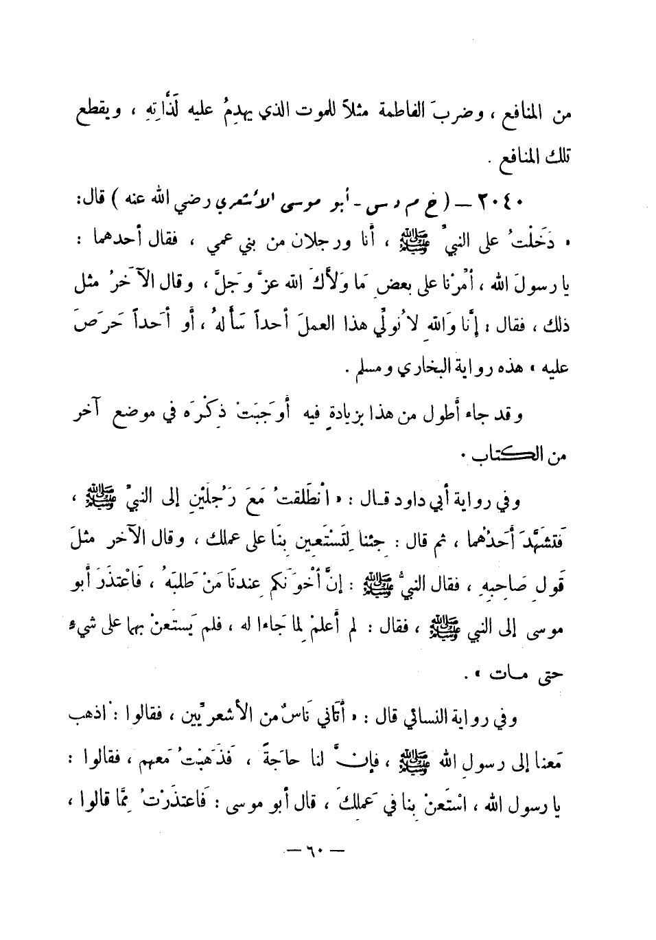 2040 - (خ م د س) أبو موسى الأشعري - رضي الله عنه -: قال: دَخَلْتُ على النبيِّ - صلى الله عليه وسلم- أنا ورجلان من بني عمي، فقال أحدهما: يا رسولَ الله، أمِّرْنا على بعض مَا وَلاكَ الله - عزَّ وجلَّ -، وقال الآخَرُ مثل ذلك، فقال: «إِنَّا وَاللهِ لا نُولِّي هذا العملَ أحداً سَأَلَهُ، أو أحَداً حَرَصَ عليه» هذه رواية البخاري، ومسلم.
