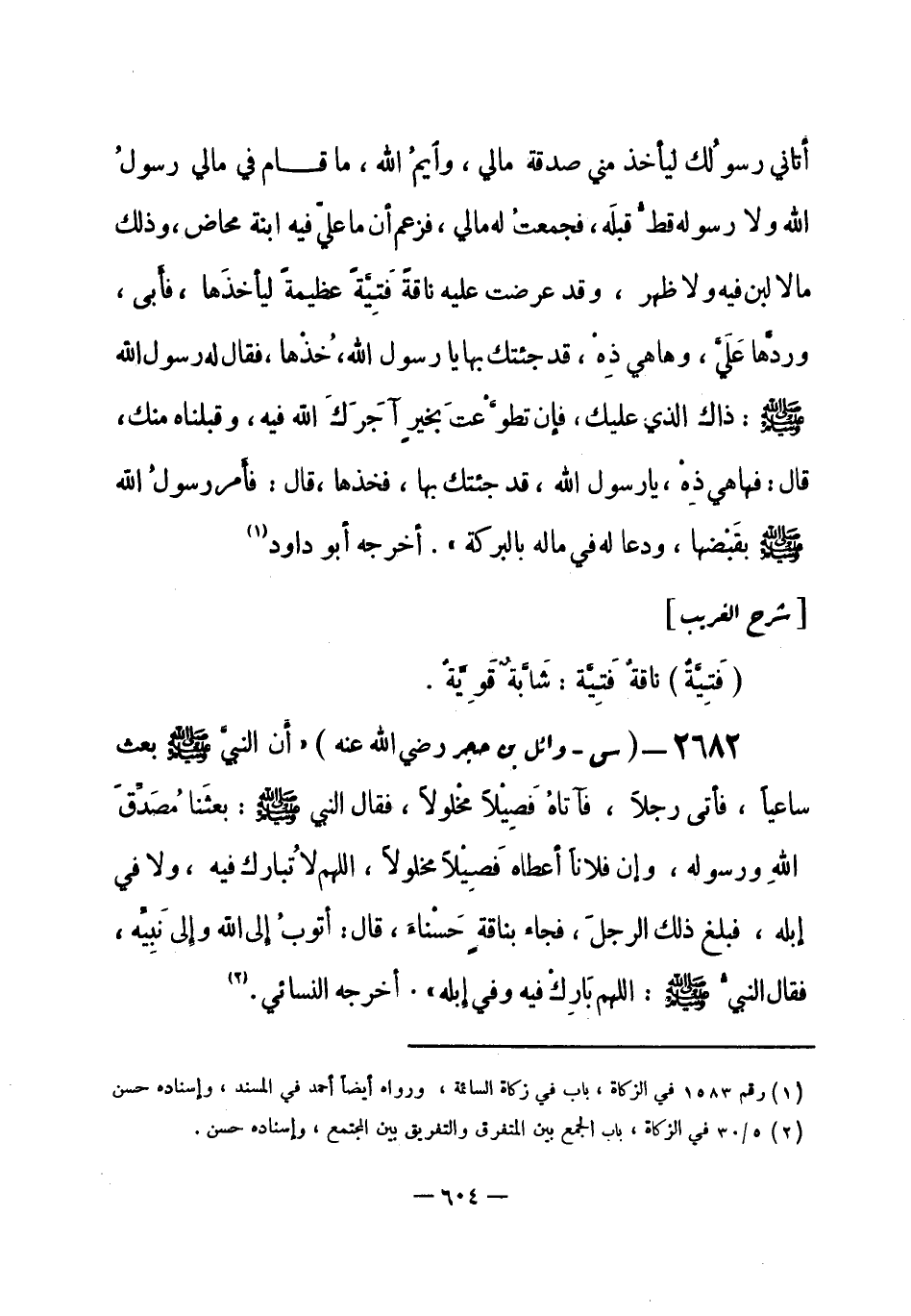 2682 - (س) وائل بن حجر - رضي الله عنه -: «أَن النبيَّ - صلى الله عليه وسلم- بعث ساعياً، فأتى رجلاً، فآتاهُ فَصِيْلاً مخْلولاً، فقال النبي -صلى الله عليه وسلم-: بعثنا مُصَدِّقَ اللهِ ورسوله، وإن فلاناً أعطاه فَصِيْلاً مخلولاً، اللهم لا تُبارك فيه، ولا في إبله، فبلغ ذلك الرجلَ فجاء بناقةٍ حَسْنَاءَ، قال: أتوبُ إلى الله وإِلى نَبِيِّه، فقال النبيُّ - صلى الله عليه وسلم-: اللهم بَارِكْ فيه وفي إِبله» . أخرجه النسائي (¬1) . -[605]-