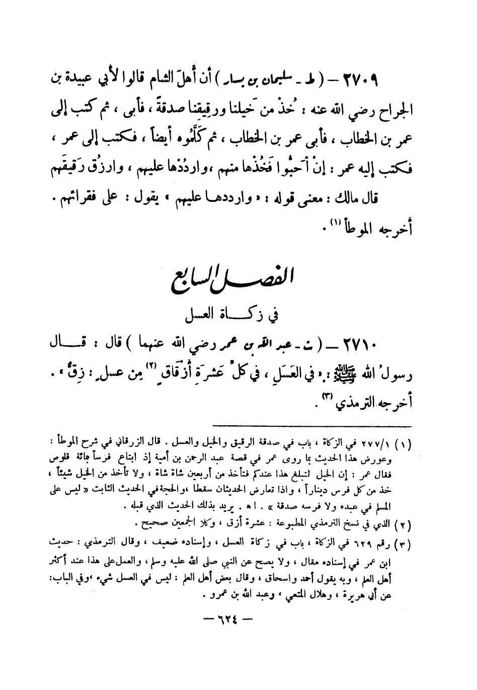2710 - (ت) عبد الله بن عمر - رضي الله عنهما -: قال: قال رسول الله - صلى الله عليه وسلم-: «في العَسَلِ، في كلِّ عَشرَةِ أَزْقَاقٍ (¬1) مِن عسلٍ: زِقٌّ» . أَخرجه الترمذي (¬2) .
