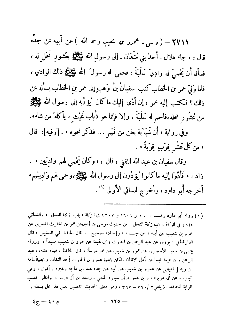 2711 - (د س) عمرو بن شعيب - رحمه الله-: عن أبيه عن جدِّه قال: «جاء هلال - أحدُ بني مُتْعَان- إِلى رسولِ الله -صلى الله عليه وسلم- بعُشورِ نَحْلٍ له، فسأله أَن يَحْميَ له وادِيَ سَلَبَةَ، فحمى له رسولُ الله -صلى الله عليه وسلم- ذلك الوادي، فلما وَلِيَ عمر بن الخطاب كتب سفيانُ بنُ وَهبٍ إلى عمر بنِ الخطاب يسأله عن ذلك؟ فكتب إِليه عمر: إِن أدَّى إِليك ما كان يُؤدِّيه إِلى رسول الله -صلى الله عليه وسلم- من عُشُورِ نحله، فاحمِ له سَلَبَةَ، وإِلا فإنما هو ذُباب غَيْثٍ، يأكلُهُ من شاء» .