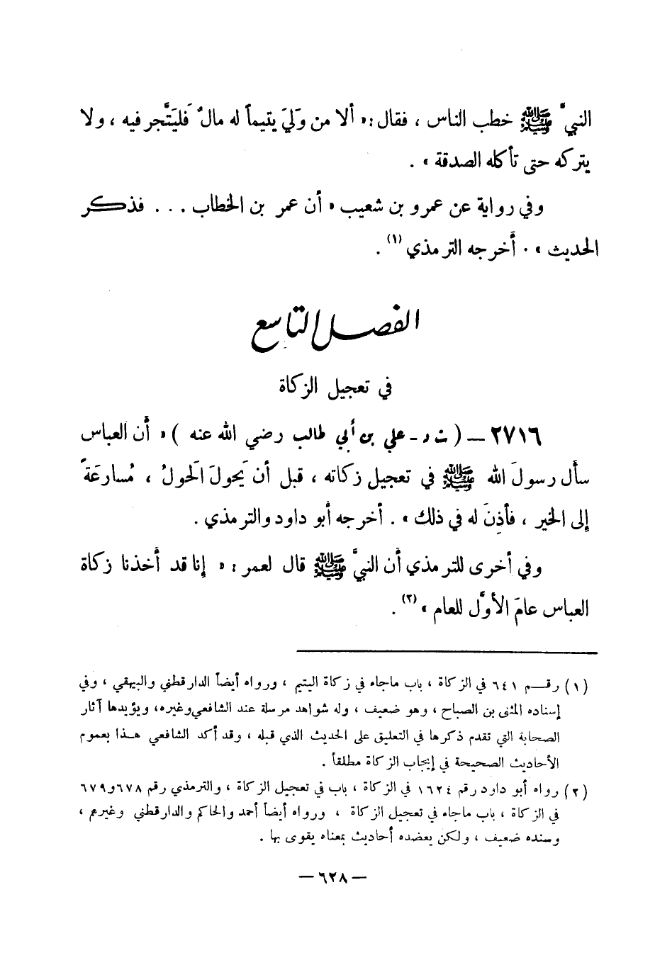 2716 - (ت د) علي بن أبي طالب - رضي الله عنه -: «أَن العباس سأَل رسولَ الله - صلى الله عليه وسلم- في تعجيل زكاته، قبل أن يَحوَل الحَولُ، مُسارَعَة إِلى الخير، فأذِنَ له في ذلك» . أَخرجه أَبو داود، والترمذي.