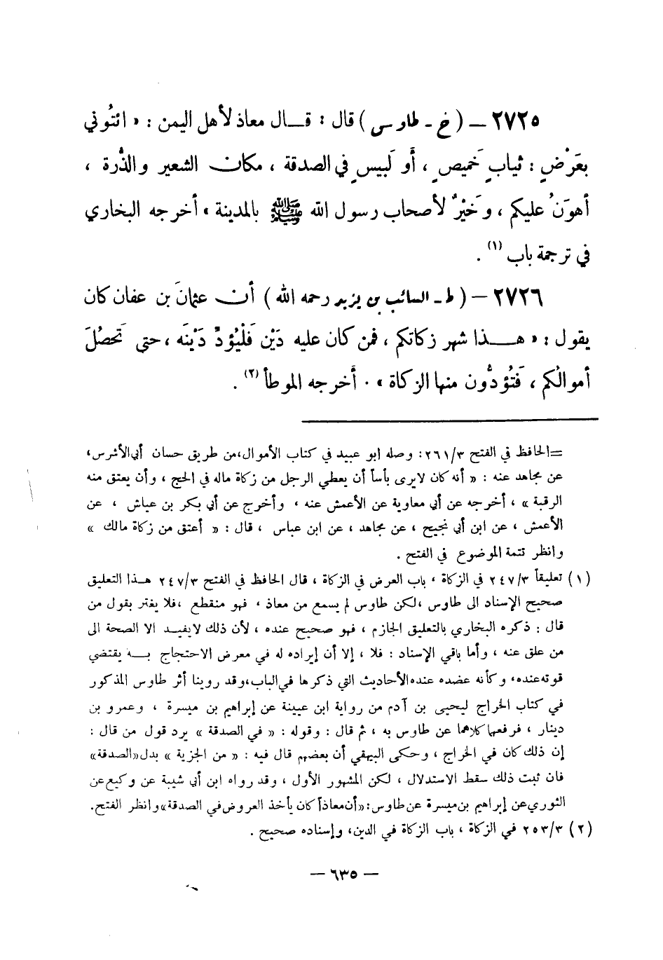 وقال الحافظ في «الفتح» : هذا التعليق صحيح الإسناد إلى طاوس، لكن طاوس لم يسمع من معاذ فهو منقطع، فلا يغتر بقول من قال: ذكره البخاري بالتعليق الجازم فهو صحيح عنده، لأن ذلك لا يفيد إلا الصحة إلى من علق عنه، وأما باقي الإسناد فلا.