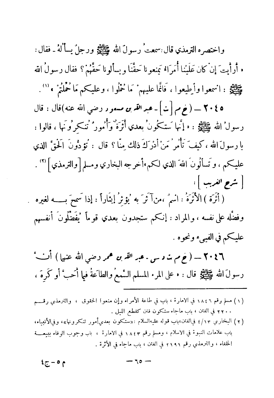 (¬1) البخاري 13 / 4 في الفتن، باب قوله عليه السلام: " ستكون بعدي أمور تنكرونها "، وفي الأنبياء، باب علامات النبوة في الإسلام، ومسلم رقم (1843) في الإمارة، باب وجوب الوفاء ببيعة الخلفاء، والترمذي رقم (2191) في الفتن، باب ما جاء في الأثرة.