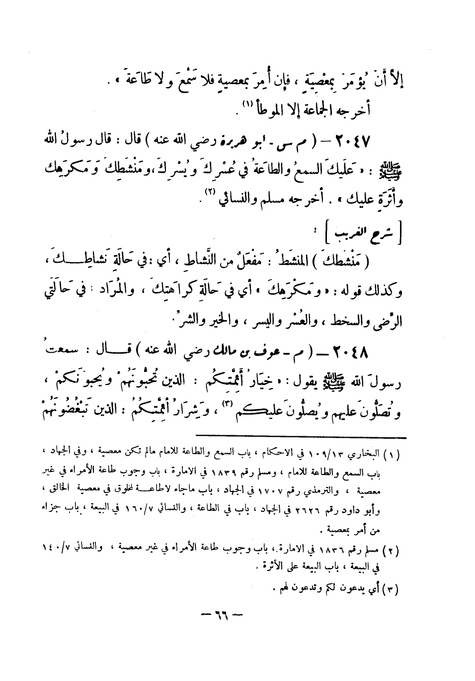 2047 - (م س) أبو هريرة - رضي الله عنه -: قال: قال رسول الله -صلى الله عليه وسلم-: «عَلَيْكَ السمعُ والطاعَةُ في عُسْرِكَ ويُسْرِكَ، ومَنْشَطِكَ وَمَكرَهِكَ وَأَثَرَةٍ عليك» أخرجه مسلم، والنسائي (¬1) .