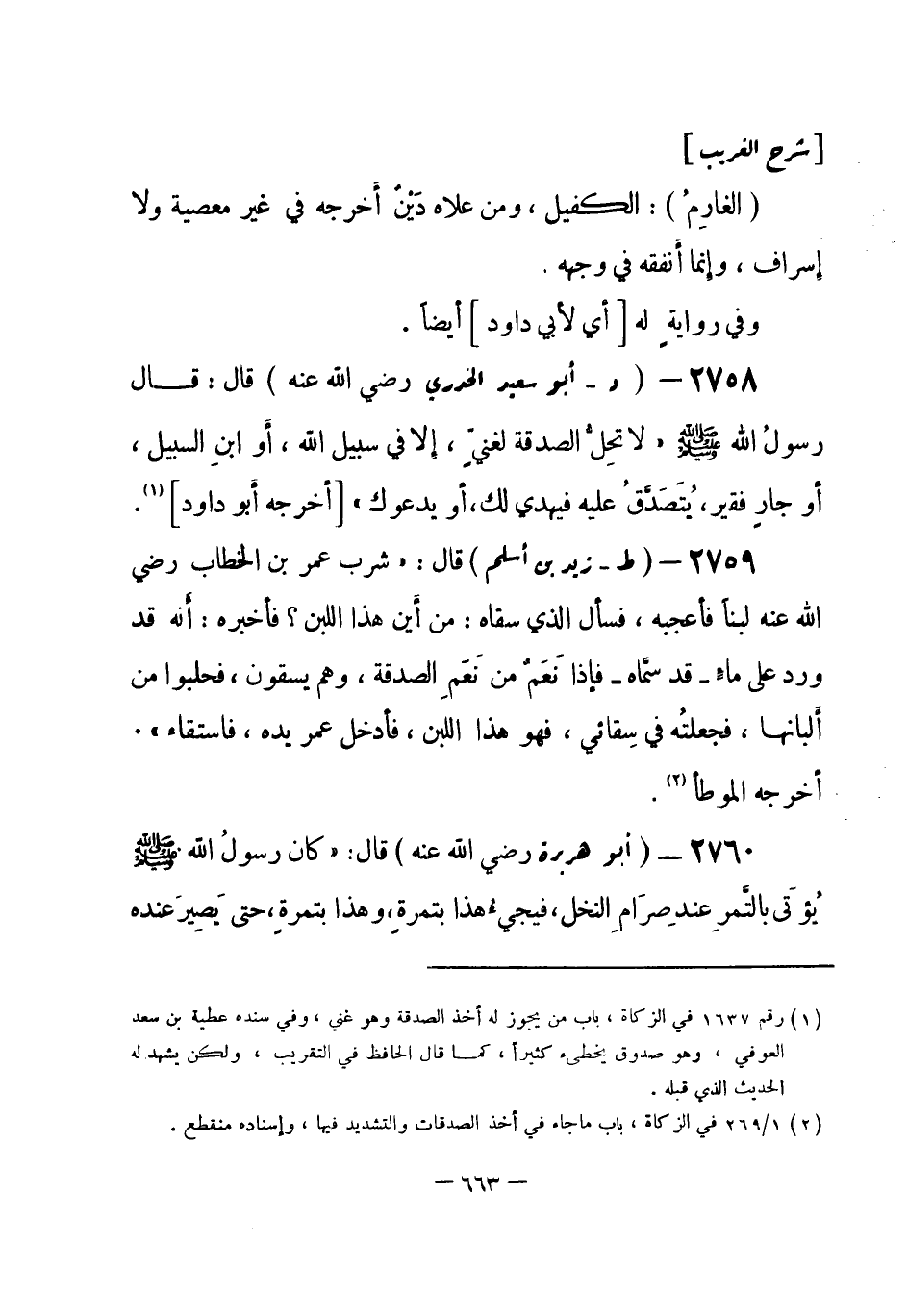 2758 - (د) أبو سعيد الخدري - رضي الله عنه -: قال: قال رسول الله - صلى الله عليه وسلم-: «لا تحِلُّ الصدقة لغنيٍّ، إِلا في سبيل الله، أَو ابنِ السبيل، أو جارٍ فقير، يُتَصَدَّقُ عليه فيهدي لك، أو يدعوك» . [أخرجه أَبو داود] (¬1) .