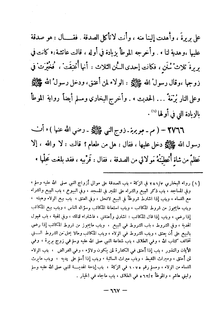 2766 - (م) جويرية - زوج النبي - صلى الله عليه وسلم- رضي الله عنها -: «أَنَّ رسولَ الله - صلى الله عليه وسلم- دخل عليها، فقال: هل من طعام؟ قالت: لا والله، إِلا عَظمٌ من شاةٍ أُعْطِيَتْهُ مَولاتي من الصدقة، فقال: قَرِّبيه، فقد بلغت مَحِلَّها» . -[668]- أخرجه مسلم (¬1) .