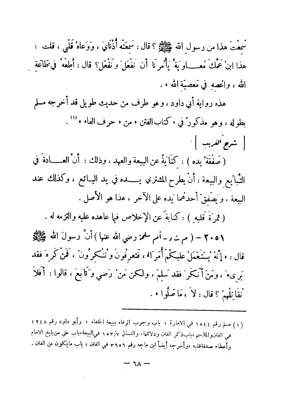 2051 - (م ت د) أم سلمة - رضي الله عنها - أنَّ رَسولَ الله - صلى الله عليه وسلم- قال: «إِنَّهُ يُسْتَعْمَلُ عليكُمْ أُمَرَاءُ، فَتعرِفُونَ وَتُنْكِرُونَ، فَمَنْ كَرِهَ فَقد بَرِئ، وَمَن أَنْكَرَ فقد سَلِمَ، ولكن مَنْ رَضي وتَابَعَ» ، قالوا: أفَلا نُقَاتِلُهمْ؟ قال: «لا، مَا صَلُّوا» . -[69]-