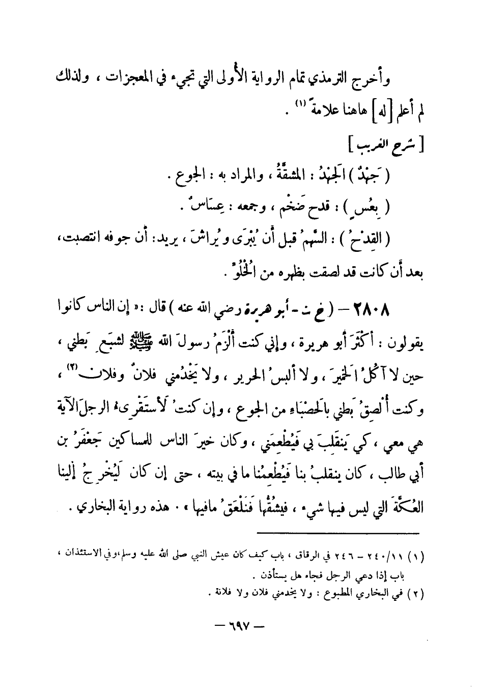 2808 - (خ ت) أبو هريرة - رضي الله عنه -: قال: «إِن الناس كانوا يقولون: أَكْثَرَ أَبو هريرة، وإِني كنت أَلْزَمُ رسولَ الله - صلى الله عليه وسلم- لِشَبعِ بَطني، حين لا آكُلُ الخَميرَ، ولا ألبسُ الحرير، ولا يَخْدُمني فلانٌ وفلان (¬1) ، وكنت أُلْصِقُ بَطني بِالحَصْبَاءِ من الجوع، وإِن كنتُ لأستَقْرِىءُ الرجلَ الآية هي معي، كي يَنقَلِبَ بي فَيُطْعِمَني، وكان خيرَ الناس للمساكين جَعْفَرُ بن أبي طالب، كان ينقلبُ بنا فَيُطْعِمُنا ما في بيته، حتى إن كان لَيُخْرِجُ إلينا العُكَّةَ التي ليس فيها شيء، فيشُقُّها فَنَلْعَقُ ما فيها» . هذه رواية البخاري. -[698]-