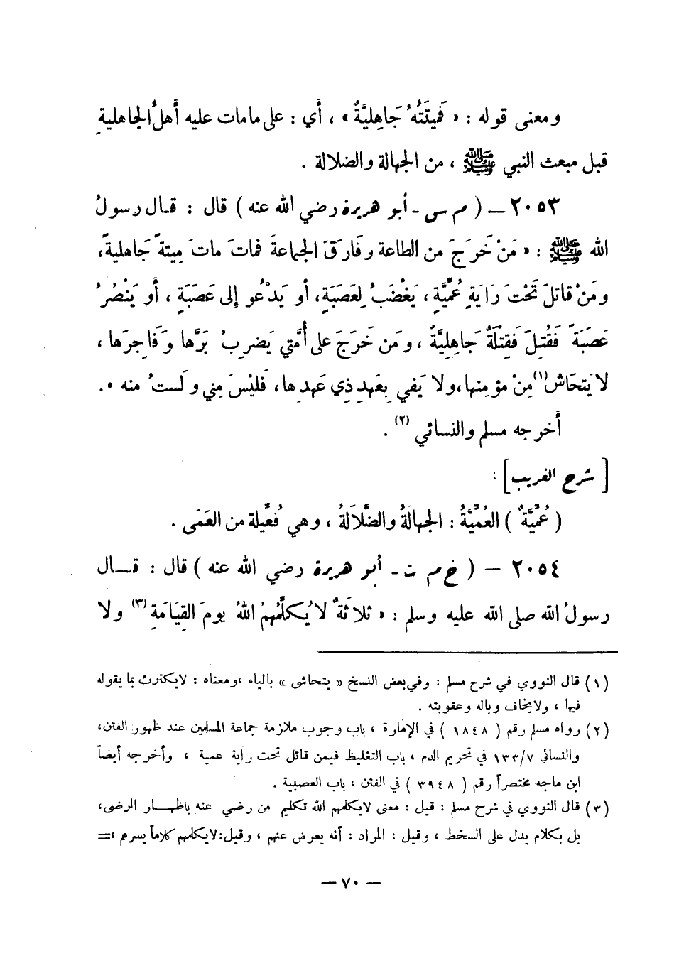 (¬2) رواه مسلم رقم (1848) في الإمارة، باب وجوب ملازمة جماعة المسلمين عند ظهور الفتن، والنسائي 7 / 133 في تحريم الدم، باب التغليظ فيمن قاتل تحت راية عمية، وأخرجه أيضاً ابن ماجة مختصراً رقم (3948) في الفتن، باب العصبية.