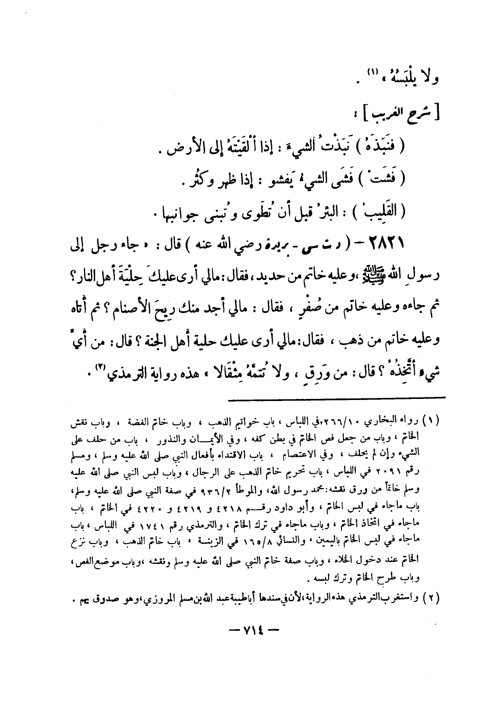 2821 - (د ت س) بريدة - رضي الله عنه -: قال: «جاء رجل إلى رسولِ الله - صلى الله عليه وسلم-، وعليه خاتم من حديد، فقال: مالي أرى عليكَ حِلْيَةَ أهل النار؟ ثم جاءه، وعليه خاتم من صُفْرٍ، فقال: مالي أجد منك رِيحَ الأصنام؟ ثم أَتاه وعليه خاتم من ذهب، فقال: مالي أرى عليك حلية أَهل الجنة؟ قال: من أَيِّ شيءٍ أَتَّخِذُهُ؟ قال: مِن وَرِقٍ، ولا تُتمَّهُ مِثْقَالاً» . هذه رواية الترمذي (¬1) . -[715]-