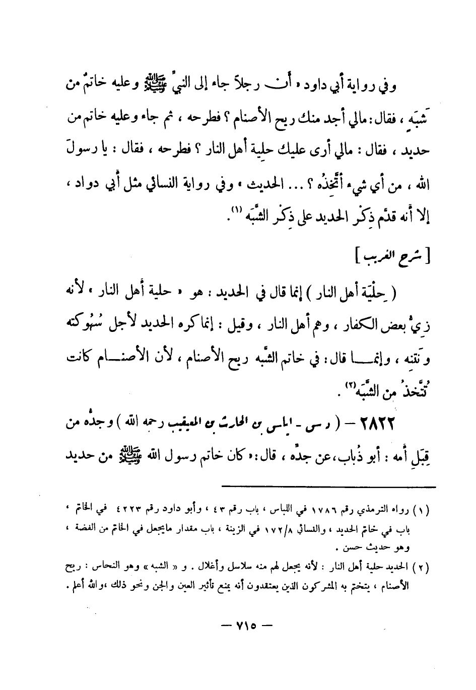 (¬1) رواه أبو داود رقم (4224) في الخاتم، باب في خاتم الحديد، والنسائي 8 / 175 في الزينة، باب لبس خاتم حديد ملوي عليه بفضة، وإسناده حسن، وله شواهد.