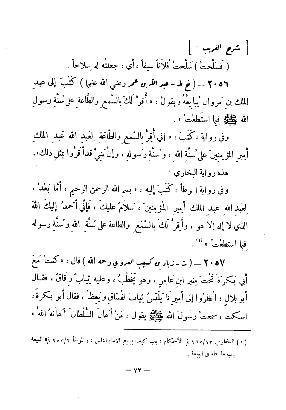 2056 - (خ ط) عبد الله بن عمر - رضي الله عنهما -: كَتَبَ إلى عبدِ الملك بنِ مَروان يُبَايِعُهُ، ويقولُ: «أُقِرُّ لَكَ بالسَّمعِ، والطَّاعَةِ على سُنَّةِ رسولِ الله - صلى الله عليه وسلم- فِيما استَطَعْتُ» .