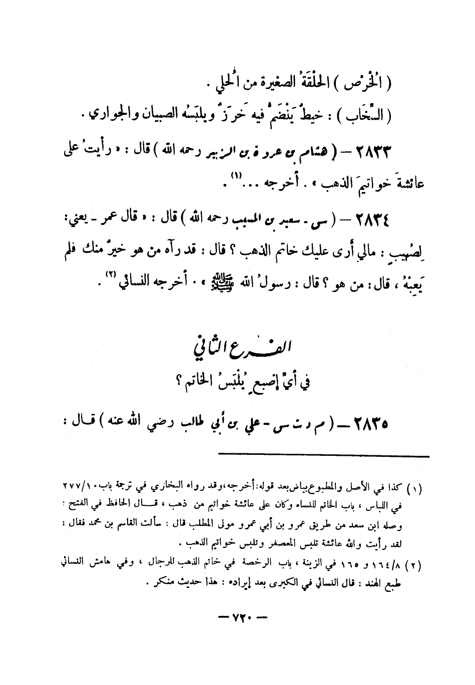 2833 - (خ) هشام بن عروة بن الزبير - رحمه الله -: قال: «رأيتُ على عائشةَ خواتيمَ الذهب» . أخرجه ... (¬1) .