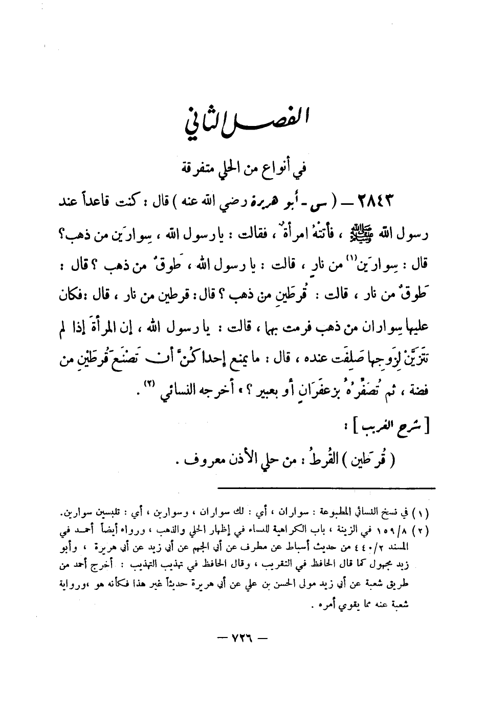 (¬1) في نسخ النسائي المطبوعة: سواران، أي: لك سواران، وسوارين، أي تلبسين سوارين.