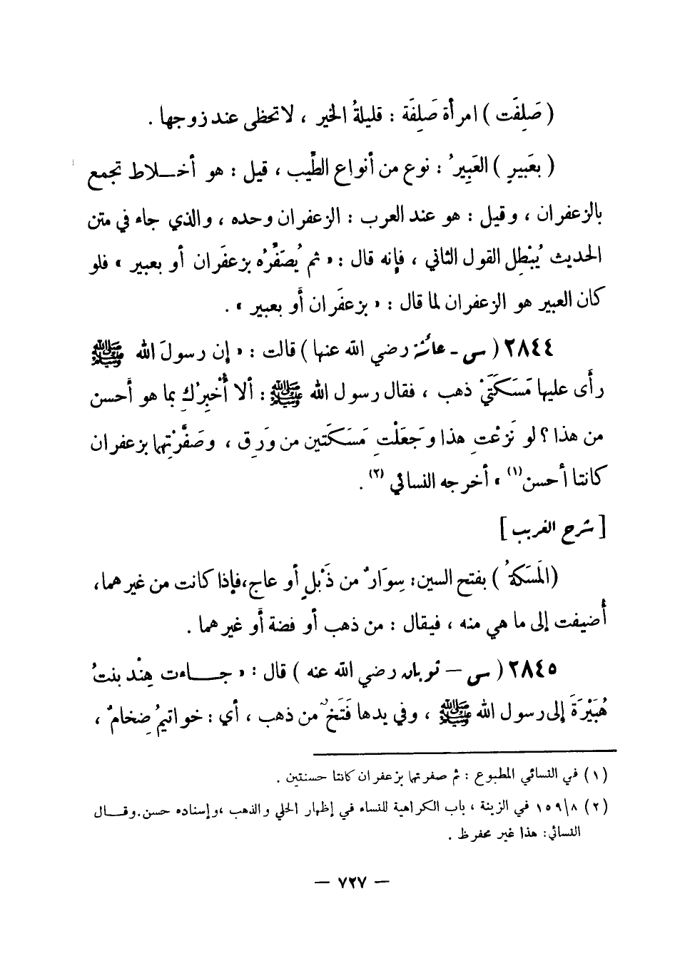 2844 - (س) عائشة - رضي الله عنها -: قالت: «إِنَّ رسولَ الله - صلى الله عليه وسلم- رأَى عليها مَسَكَتَيْ ذهب، فقال رسولُ الله - صلى الله عليه وسلم-: أَلا أُخْبِرُك بِمَا هو أَحسن من هذا؟ لو نَزَعْتِ هذا وَجَعَلْتِ مَسَكَتين من وَرِق، وصَفَّرْتِهما بزعفران كانتا أحسن (¬1) » . أخرجه النسائي (¬2) .