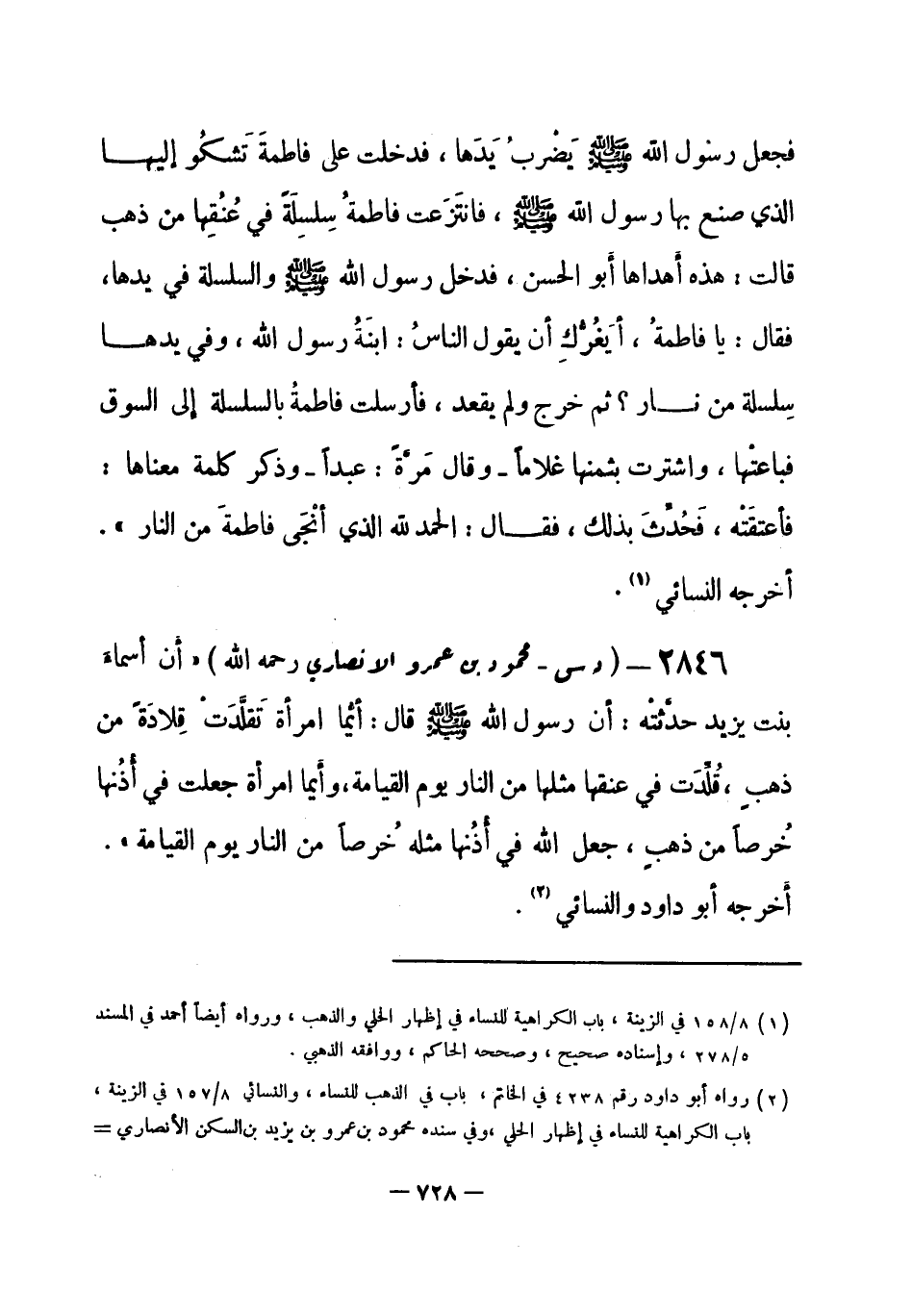 2846 - (د س) محمود بن عمرو الأنصاري - رحمه الله-: أَن سماء بنت يزيد حدَّثتْهُ: أَنَّ رسولَ اللهِ - صلى الله عليه وسلم- قال: «أيُّما امرأة تَقَلَّدَتْ قِلادَة من ذهبٍ، قُلِّدَت في عنقها مثلها من النار يوم القيامة، وأَيما امرأة جعلت في أُذُنها خُرصاً من ذهبٍ، جعل الله في أُذُنها خُرصاً من النار يوم القيامة» . أَخرجه أبو داود، والنسائي (¬1) . -[729]-