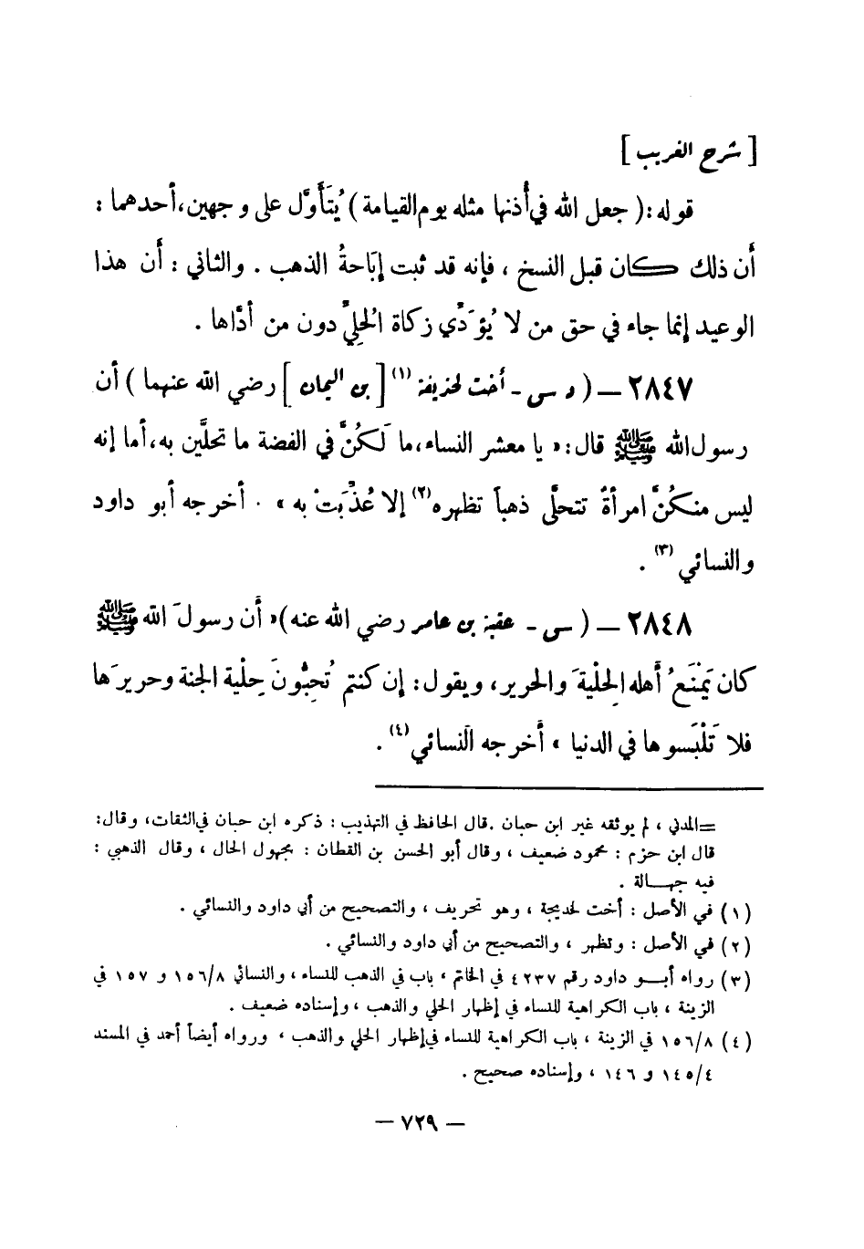 (¬3) رواه أبو داود رقم (4237) في الخاتم، باب في الذهب للنساء، والنسائي 8 / 156 و 157 في الزينة، باب الكراهية للنساء في إظهار الحلي والذهب، وإسناده ضعيف.