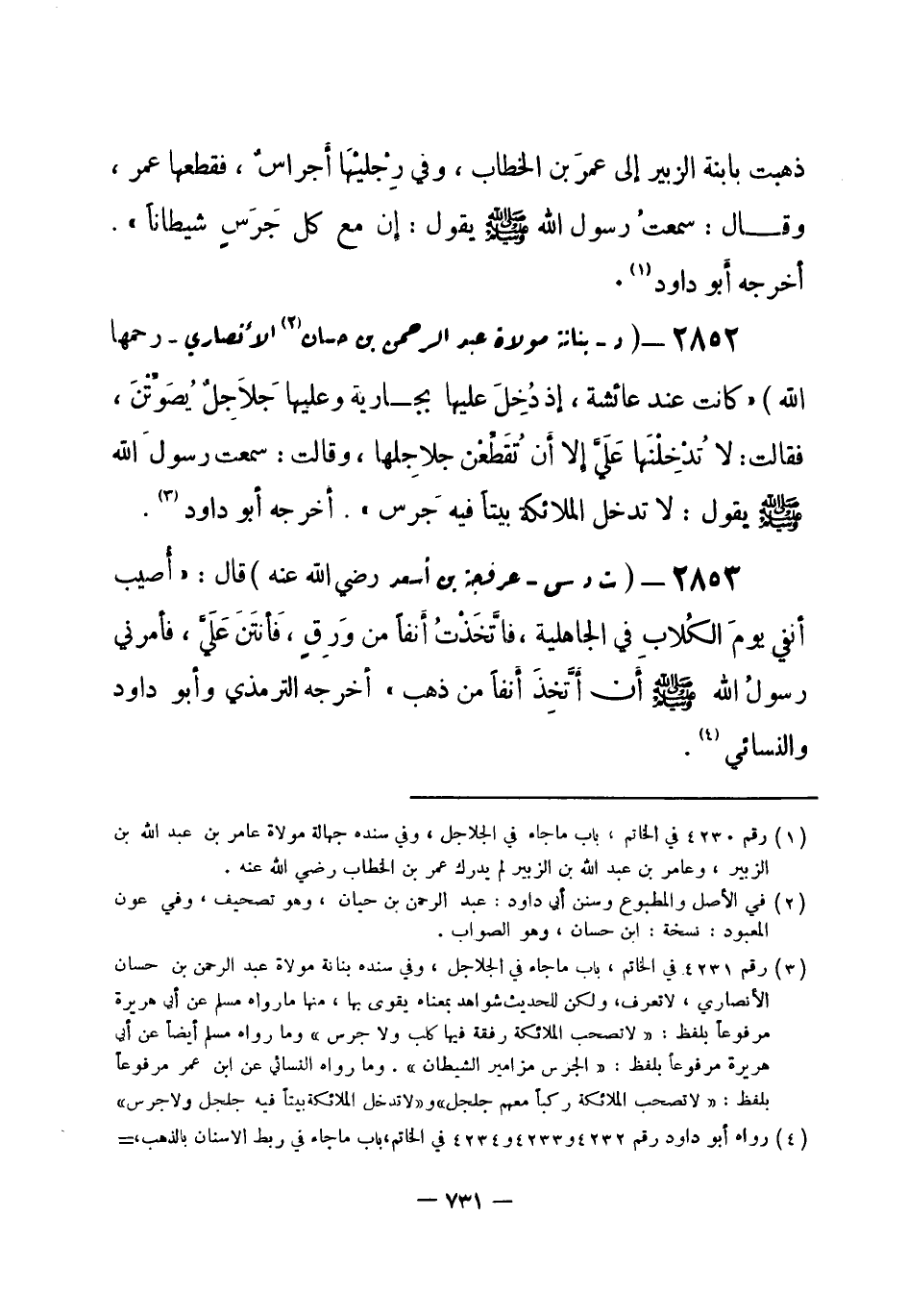 (¬2) رقم (4231) في الخاتم، باب ما جاء في الجلاجل، وفي سنده بنانة مولاة عبد الرحمن بن حسان الأنصاري، لا تعرف، ولكن للحديث شواهد بمعناه يقوى بها، منها ما رواه مسلم عن أبي هريرة مرفوعاً بلفظ: " لا تصحب الملائكة رفقه فيها كلب ولا جرس "، وما رواه مسلم أيضاً عن أبي هريرة مرفوعاً بلفظ " الجرس مزامير الشيطان ". وما رواه النسائي عن ابن عمر مرفوعاً بلفظ: " لا تصحب الملائكة ركباً معهم جلجل " و " لا تدخل الملائكة بيتاً في جلجل ولا جرس ".