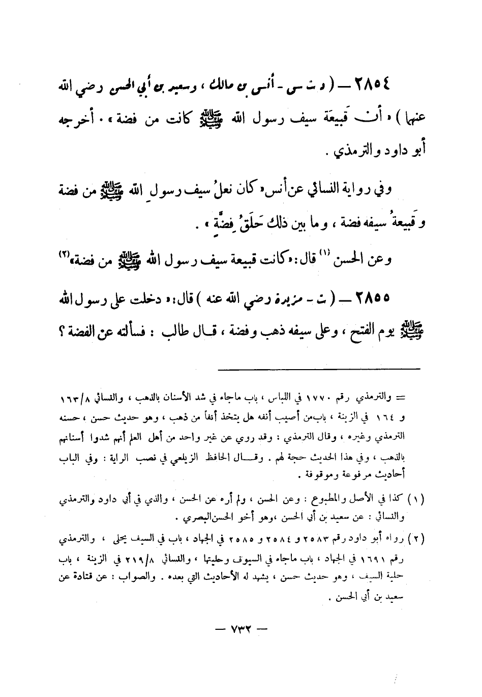 2854 - (د ت س) أنس بن مالك، وسعيد بن أبي الحسن - رضي الله عنهما -: «أن قَبيعَة سيف رسول الله - صلى الله عليه وسلم- كانت من فضة» . أخرجه أبو داود، والترمذي.