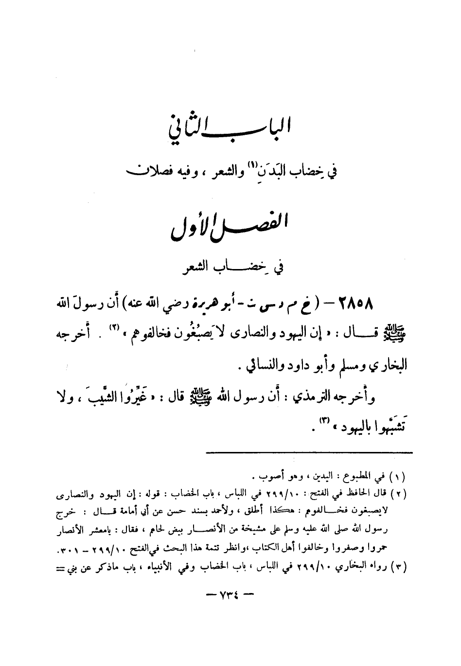 (¬2) قال الحافظ في " الفتح ": 10 / 299 في اللباس، باب الخضاب: قوله: إن اليهود والنصارى لا يصبغون فخالفوهم: هكذا أطلق، ولأحمد بسند حسن عن أبي أمامة قال: خرج رسول الله صلى الله عليه وسلم على مشيخة من الأنصار بيض لحاهم، فقال: يا معشر الأنصار حمروا وصفروا وخالفوا أهل الكتاب، وانظر تتمة هذا البحث في " الفتح " 10 / 299 - 301.